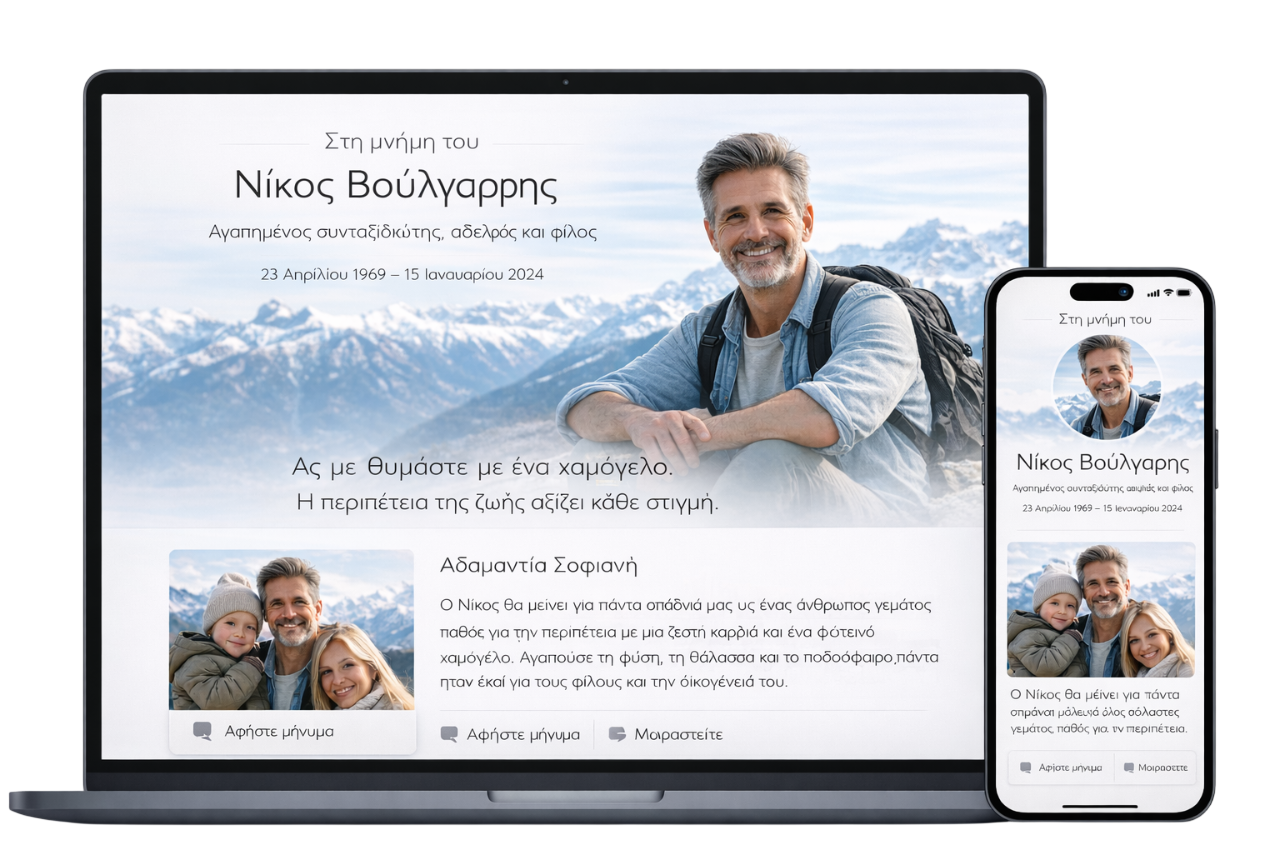 Μάθετε πώς λειτουργείΔημιουργούμε εμείς το ψηφιακό μνημείο για την οικογένεια.Οι συγγενείς θέλουν να τιμήσουν τη μνήμη — όχι να σχεδιάζουν ιστοσελίδες, να γράφουν από την αρχή ή να ασχολούνται με τεχνικά ζητήματα.